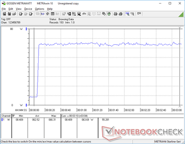 De kleine (7,5 x 7,5 x 2,9 cm) 90 W AC-adapter verbruikt maximaal 63 W wanneer zowel Prime95 als FurMark tegelijkertijd worden gebruikt. De adapter heeft meer dan genoeg hoofdruimte om zowel het systeem van stroom te voorzien als de batterij met een redelijke snelheid op te laden.