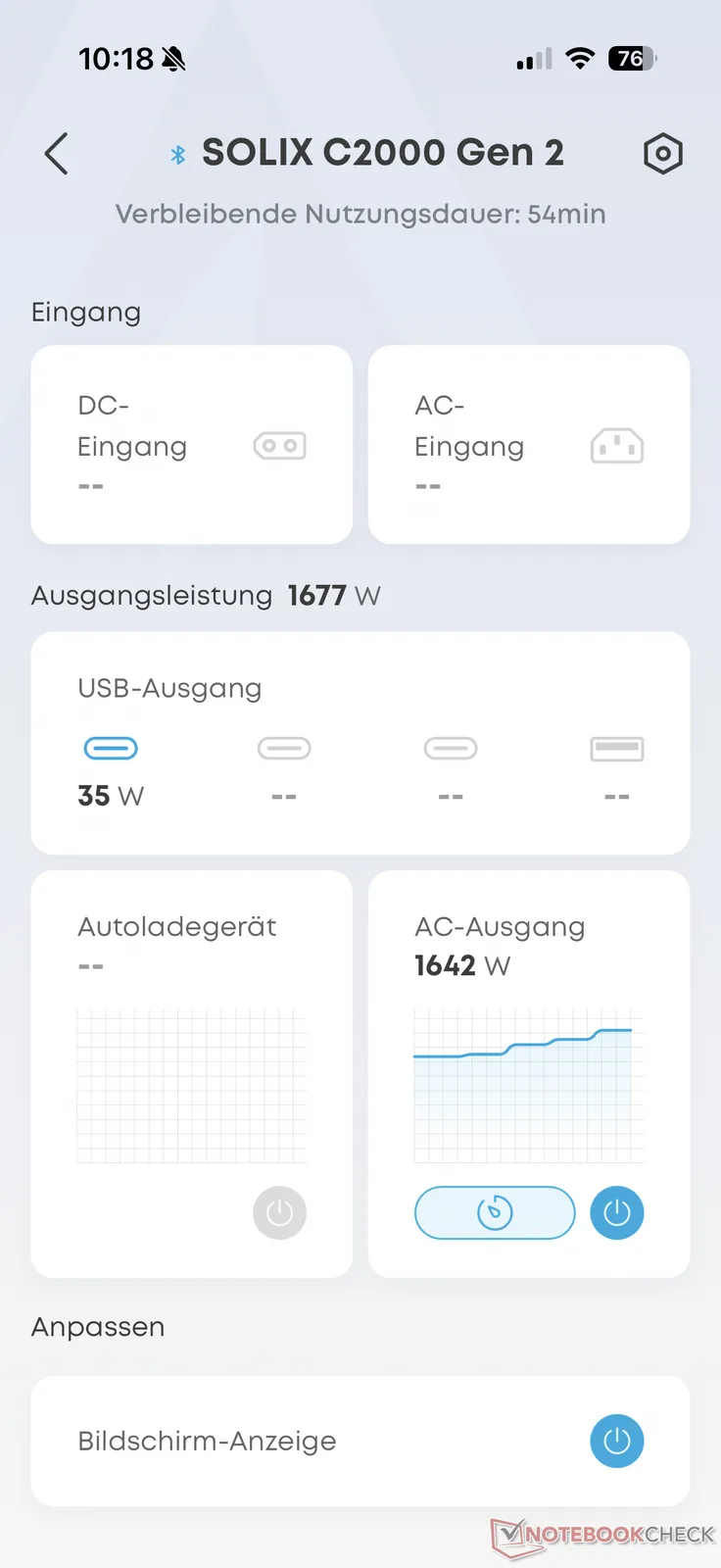 Met zijn 2.400 W (piek 4.000 W) voorzag de C2000 Gen 2 tijdens de test een groot aantal apparaten op betrouwbare wijze van energie. Een ander positief aspect is dat de energiecentrale aanzienlijk zuiniger is geworden in inactieve toestand. Als u vergeet om het hele apparaat of de AC-poorten uit te schakelen, verliest u minder energie.