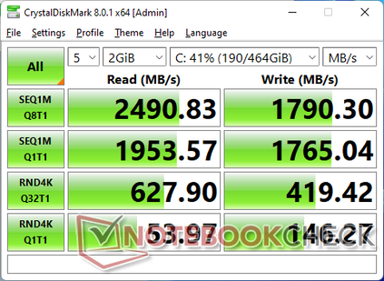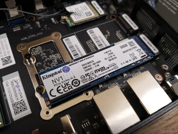 Onze testeenheid wordt geleverd met een midrange 500 GB Kingston NV1 PCIe3 x4 SSD. PCIe4 snelheden worden niet ondersteund, in tegenstelling tot de nieuwste Intel NUC's die draaien op 11e generatie Core CPU's. De Kingston schijf vertoont verder geen problemen om zijn maximale overdrachtssnelheid van ~2300 MB/s gedurende langere perioden te behouden.