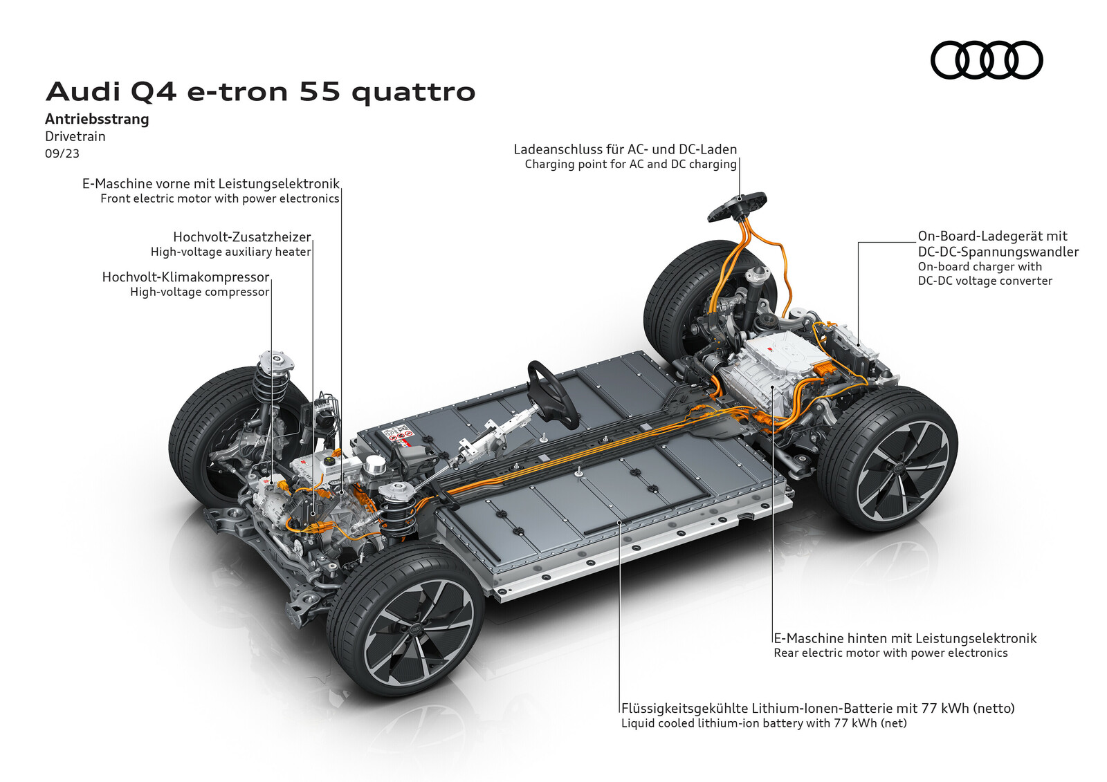 Zowel de achterwielaangedreven als quattro AWD-versies van de Q4 e-tron 45 leveren 210 kW (286 pk), terwijl de Q4 e-tron 55 in alle versies 250 kW (340 pk) kan leveren. Hoewel het motorvermogen identiek is voor de gewone en Sportback-versies, is het Sportback-ontwerp aerodynamischer, waardoor de actieradius in alle uitvoeringen iets is verbeterd.