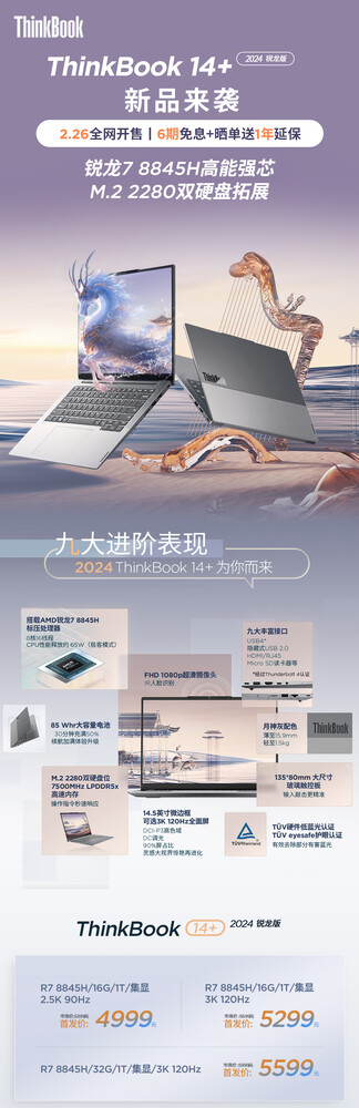 Wat de prijs betreft: de Ryzen Edition 2024 ThinkBook 14+ laptop begint bij CNY4999 (ongeveer $694), en de 16+ begint bij CNY5399 (ongeveer $750). Er is nog niets bekend over wereldwijde beschikbaarheid, maar Lenovo biedt wel ThinkBook-laptops met AMD Ryzen-processors aan voor regio's buiten China (AMD ThinkBook 14 Gen 6 met Ryzen 7530U verkrijgbaar op Amazon). Er is dus een kans dat deze op de internationale markten debuteren als Gen 7-notebooks met een nieuwe naam, met Ryzen 7 8845HSaangezien de 8845H exclusief is voor China.