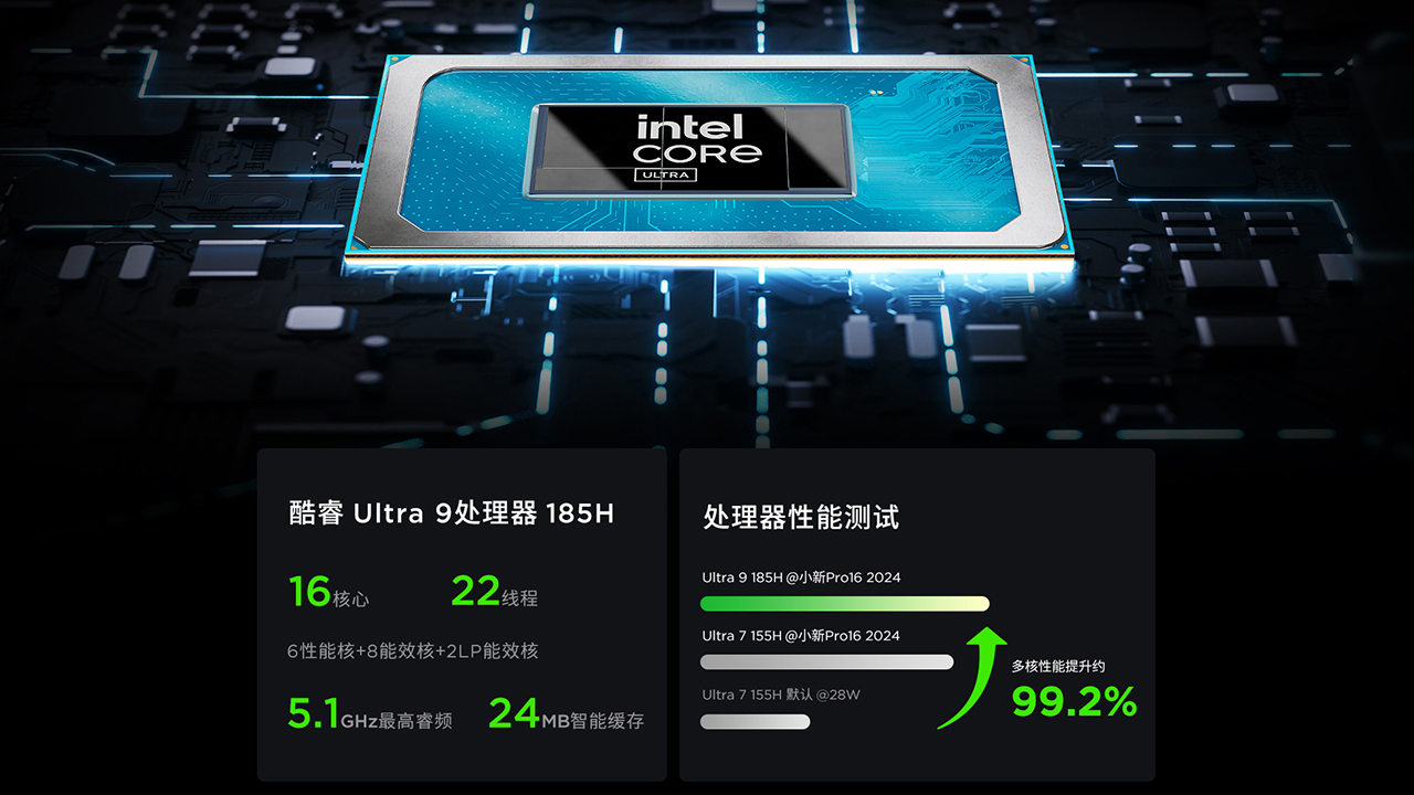 De 2024 Xiaoxin Pro 16 is uitgerust met de nieuwste Intel Core Ultra 9 185H. Deze Meteor Lake processor heeft 16 kernen en 22 threads. Lenovo zegt dat de CPU tot 80W aan prestaties kan leverenwat erop wijst dat de laptop zware werklasten met gemak aankan.