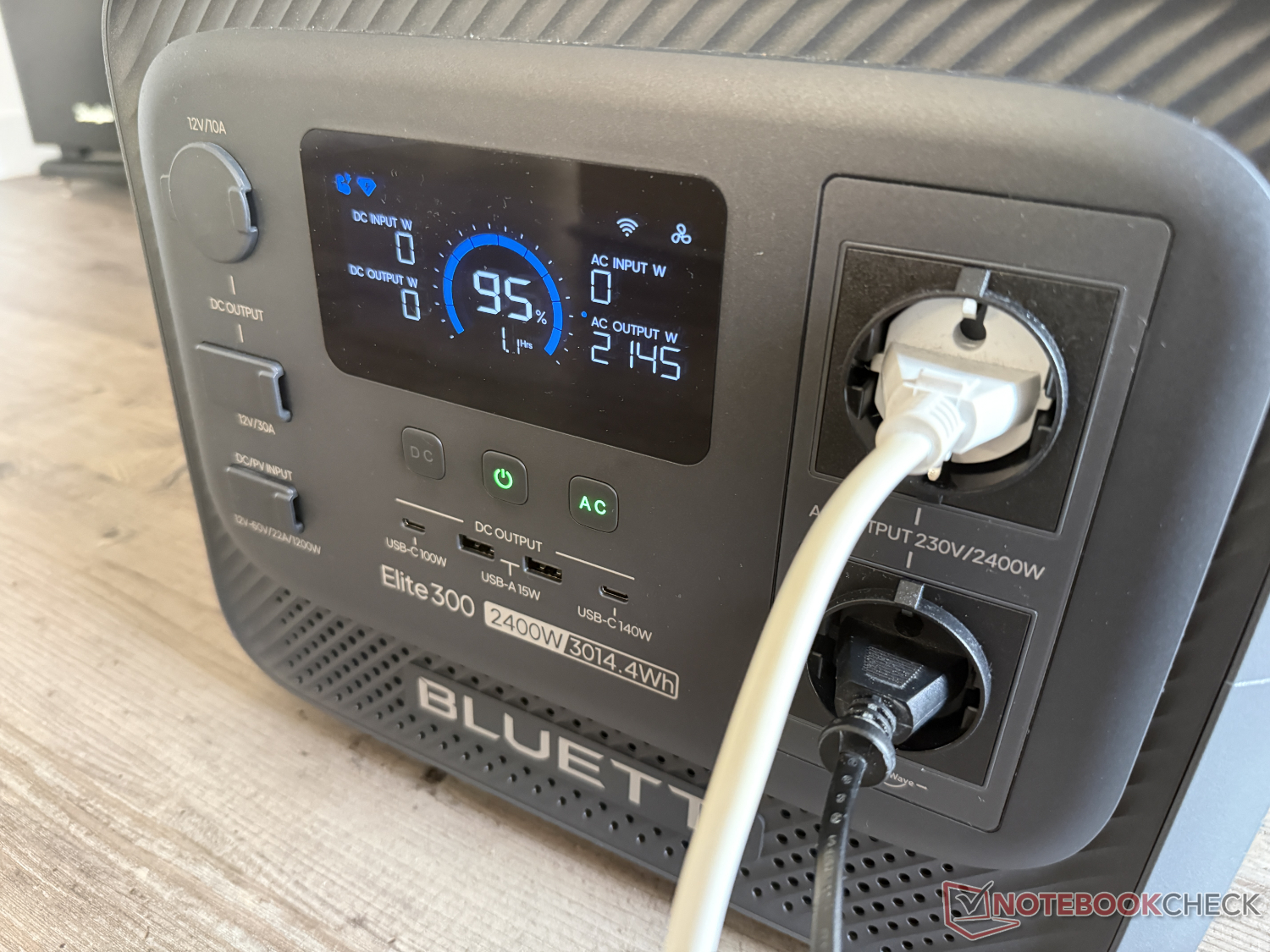 Het AC uitgangsvermogen is 2.400 W bij 230 V, dat voor korte periodes tot 4.800 W kan worden verhoogd. Naast twee AC-aansluitingen zijn er vier USB-poorten (twee USB-A met 15 W, één USB-C met 100 W en één USB-C met 140 W), een 12 V autoaansluiting (sigarettenaansteker) met een maximum van 120 W en een DC-aansluiting met 12 V en 30 A aan de voorkant.