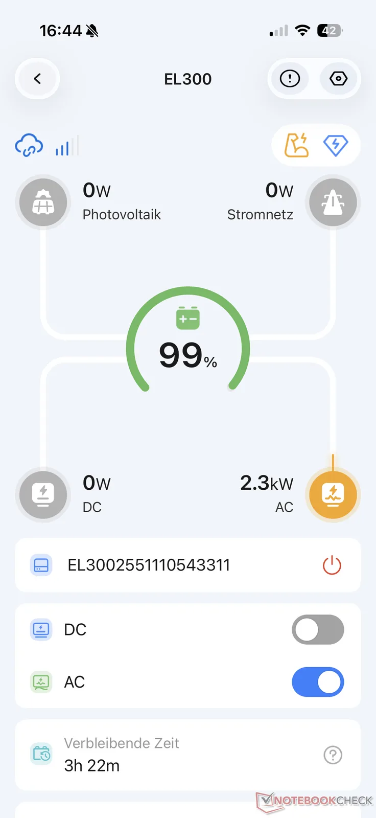 Het tot stand brengen van de verbinding werkte tijdens de test zonder problemen. Het overzicht toont vervolgens niet alleen de huidige vermogenswaarden tijdens het opladen en ontladen. De AC- en DC-poorten kunnen ook in- en uitgeschakeld worden. De app toont ook de resterende levensduur van de batterij tijdens de huidige lading.