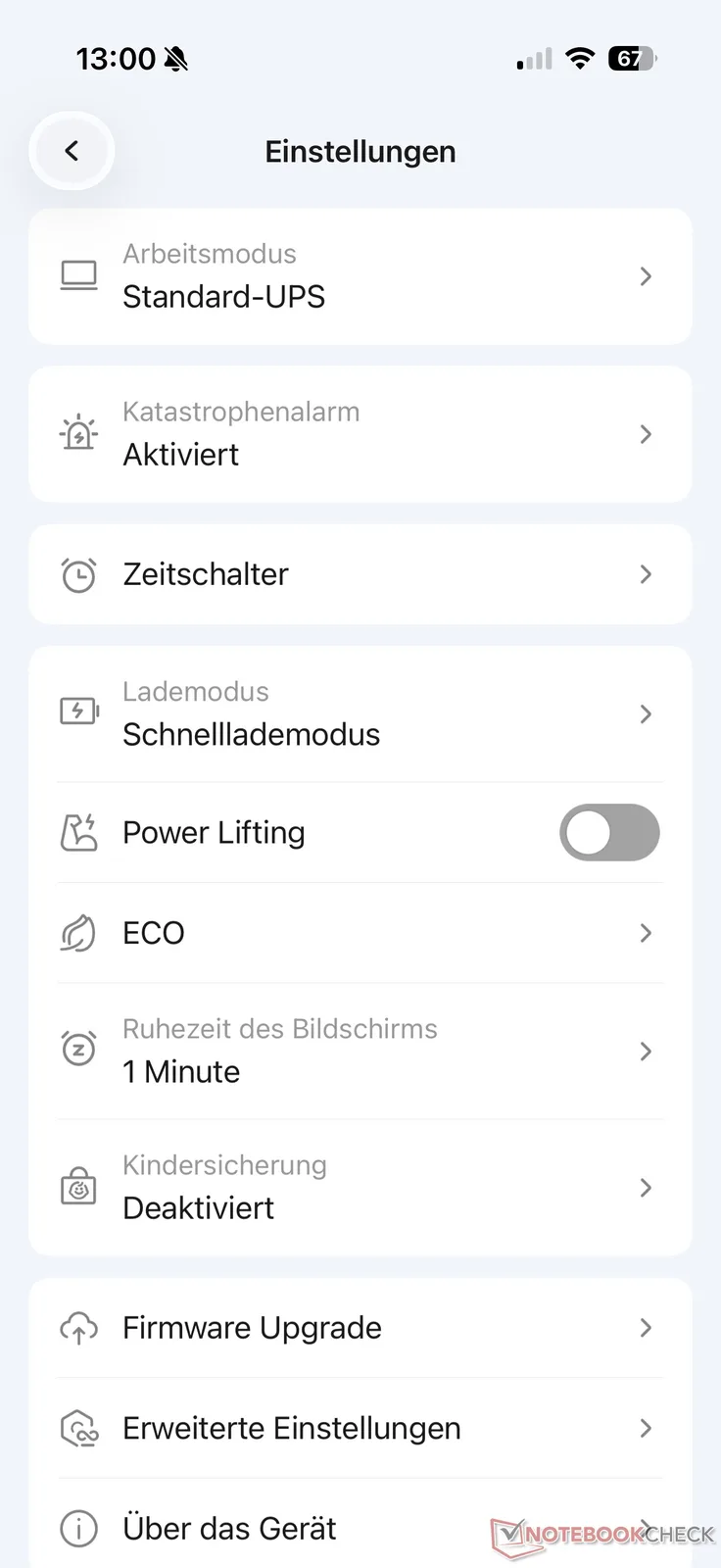 Verschillende opties zoals opladen, energie opheffen of de eco-modus zijn toegankelijk via de instellingen. Er is bijvoorbeeld ook een kinderslot en firmware-updates. We hadden hier echter graag één of twee opties meer gehad, zoals opladen tijdens daluren.