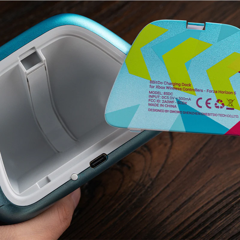 Het 8BitDo Oplaaddock voor Xbox draadloze controllers - Forza Horizon 6 Limited Edition is een samenwerking tussen 8BitDo, Xbox, en Forza Horizon 6. Het dock is ontworpen om te werken met Xbox Series X|S controllers en heeft drie pogo pinnen voor het opladen, naast twee magneten om ervoor te zorgen dat uw controller goed op zijn plaats zit. Het heeft ook een opbergvak voor reservebatterijen, batterijkleppen en kleine accessoires.