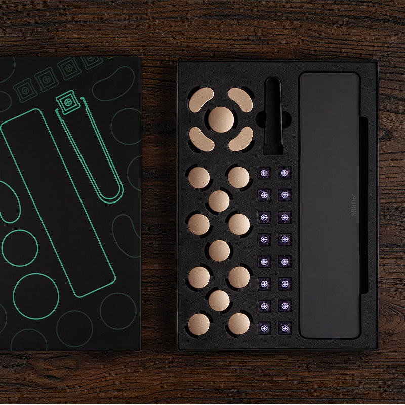 De upgradekit wordt geleverd met 16 Kailh Purple Glede lineaire schakelaars, die stil zijn en een kortere pre-travel afstand van 0,8 mm hebben. 8BitDo levert ook gouden keycaps ter vervanging van de zwarte en rode die bij de controller worden geleverd. Kopers vinden in de doos ook een keycap-trekker en een polssteun.