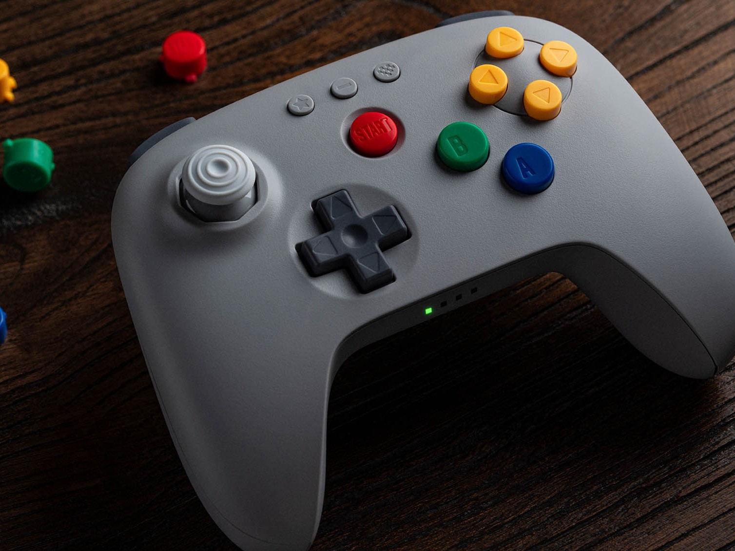 De Classic Gray 8BitDo 64 Bluetooth Controller is een eerbetoon aan de originele Nintendo 64 Controller. Niet alleen heeft de behuizing dezelfde grijze kleur, maar hij heeft ook een rode startknop, gele C-knoppen, een groene B-knop en een blauwe A-knop. De D-Pad is donkergrijs, net als de schouderknoppen, terwijl het kapje van de joystick lichtgrijs is.