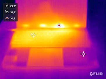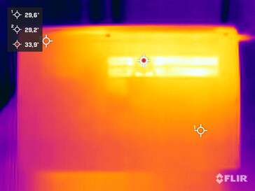 (+) Bij onbelast gebruik bedraagt de gemiddelde temperatuur voor de bovenzijde 30.8 °C / 87 F, vergeleken met het apparaatgemiddelde van 29.5 °C / 85 F.