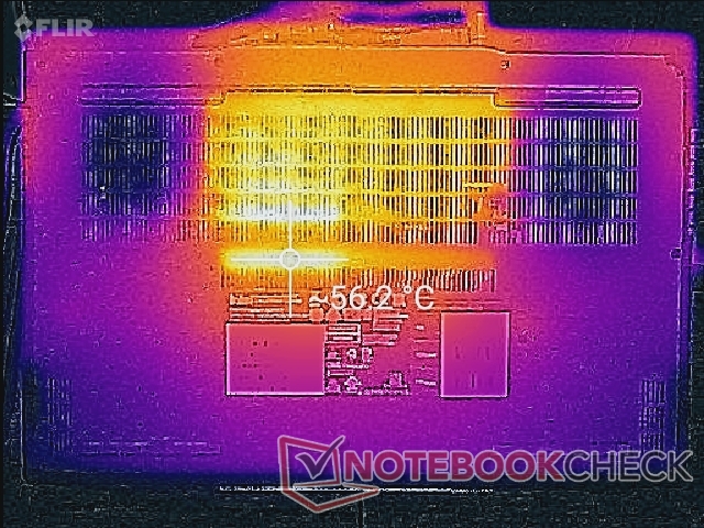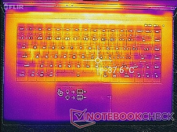 De oppervlaktetemperaturen zijn over het algemeen erg warm, zelfs wanneer de laptop stationair draait, omdat de ventilatoren de neiging hebben stationair te draaien. Hete plekken onder een dergelijke scneario kunnen oplopen tot 38 C of 42 C aan de boven- en onderkant van de laptop, respectievelijk. Het midden van het toetsenbord kan oplopen tot 50 C tijdens het gamen, vergeleken met 45 C op de MSI GS66 of Razer Blade 15 Advanced.