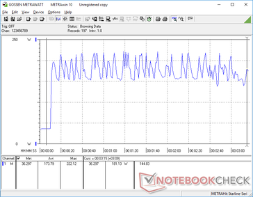 We zijn in staat om een maximum van 222 W te halen uit de middelgrote (~15,1 x 7,5 x 2,6 cm) 230 W AC adapter wanneer we tegelijkertijd Prime95 en FurMark draaien. Het verbruik schommelt sterk tussen 150 W en 222 W, waarschijnlijk door thermische problemen. De batterij zal ook langzamer opladen bij zulke hoge belastingen, maar zal niet langzaam leeglopen na verloop van tijd.