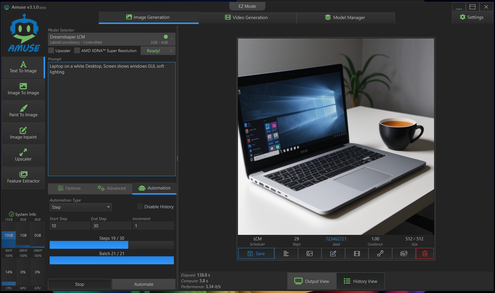 We draaiden Amuse in de nieuwste versie op het moment van testen (3.1). De software is gratis en wordt gemakkelijk geïnstalleerd. De NPU van de AMD processor wordt hier ondersteund, wat het werken met AI merkbaar zou moeten versnellen, zelfs zonder een speciale GPU. Naast het genereren van tekst-naar-beeld, biedt het ook beeld-naar-video en beeld-naar-beeld functionaliteiten.