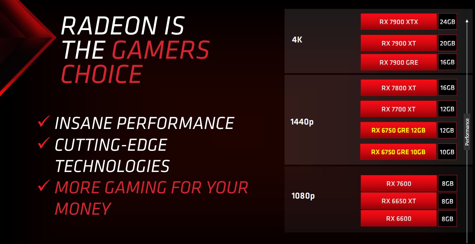 Volgens AMD staan beide Radeon RX 6750 GRE kaarten tussen de Radeon RX 7600 en Radeon RX 7700 XT in 1440p games met hoge instellingen. Het bedrijf heeft ook geprobeerd om de voordelen van het gebruik van 12 GB VRAM te benadrukken, waardoor het Radeon RX 6750 GRE paar zich onderscheidt van NVIDIA's alternatieven zoals de GeForce RTX 4060. Beide Radeon RX 6750 GRE-modellen zijn verkrijgbaar vanaf 18 oktober, waarbij US$20 het verschil maakt tussen het paar van US$269 voor het 10 GB model en US$289 voor de 12 GB tegenhanger.