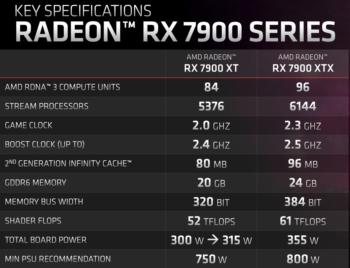 | Specificaties | Radeon RX 7900 XTX | Radeon RX 7900 XT | Radeon RX 6950 XT | Radeon RX 6900 XT | Radeon RX 6800 XT | Radeon RX 6800 |