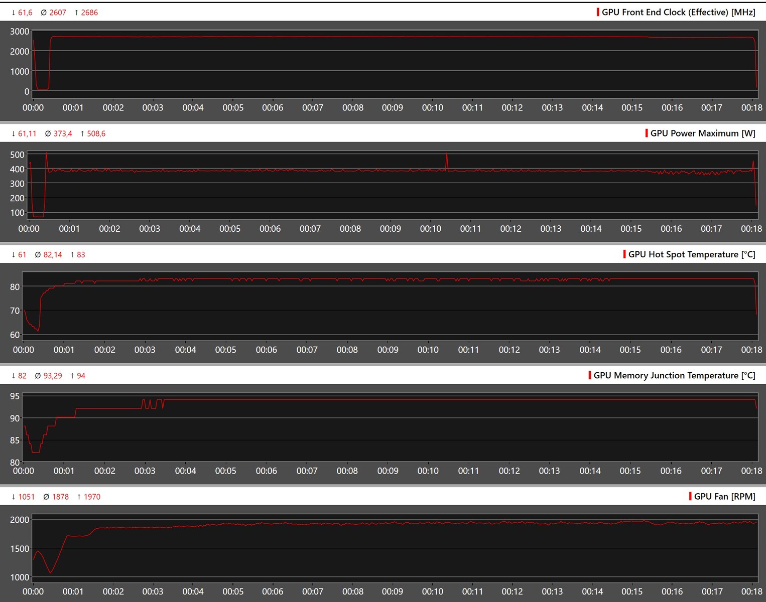 We zien een maximum van 86 °C als GPU hotspot waarde voor het XTX model. De GPU throttled pas boven 110 °C, wat kan leiden tot prestatieverlies. Ondertussen wordt het VRAM iets warmer, tot 94 °C in de stresstest. Bij het XT-model zien we vergelijkbare hoge temperaturen bij het VRAM, hoewel de GPU consequent koeler werkt dan zijn grotere neef.