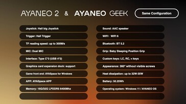 Terwijl zowel de AYANEO GEEK en AYANEO 2 dezelfde AMD Ryzen 7 6800U processor, komt de eerste met veel minder kleuropties en hardwareconfiguraties om uit te kiezen. Volgens AYANEO, "de configuratie van AYANEO 2 is meer high-end, meer toekomstige technologie, als gevolg van front bezel-less scherm ondersteuning, het algemene visuele effect is beter. "