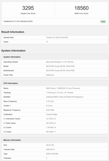 In de eerste run op https://browser.geekbench.com/v6/cpu/8429253scoort de CPU 3.295 en 18.560 punten in de single- en multi-core tests van Geekbench 6.2. In de tweede run https://browser.geekbench.com/v6/cpu/8460024scoort hij 3.305 en 18.221. Hoewel beide scores ruim binnen de foutmarge liggen, werden ze uitgevoerd op compleet verschillende platforms. De eerste werd uitgevoerd op een Biostar X870E moederbord met 48 GB DDR5-8000 RAM, terwijl de tweede werd uitgevoerd op een Asus ROG Crosshair X870E moederbord met dezelfde hoeveelheid geheugen.