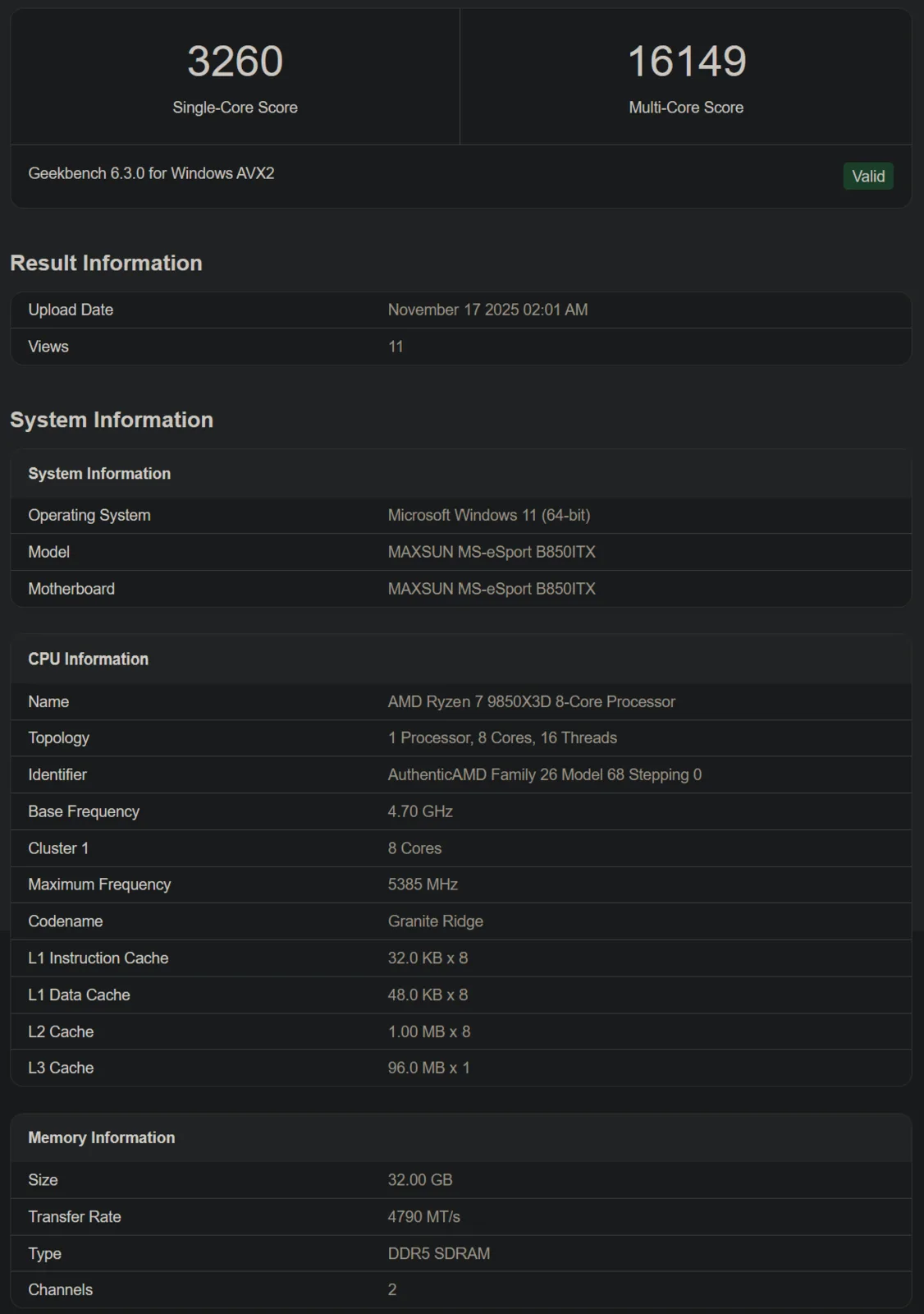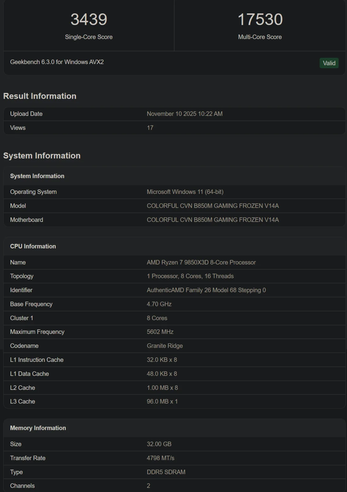In de ene staat 5,6 GHz, in de andere 5,4 GHz. Maar goed, de chip is getest op verschillende moederborden, en dat kan de resultaten beïnvloed hebben. In de eerste run naast de Colorful B850M, scoort de Ryzen 7 9850X3D 3.439 en 17.530 punten en 3.260/16.149 in de tweede (Maxsun B850ITX moederbord).