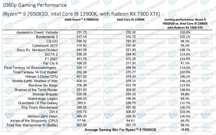 Over het geheel genomen was het Ryzen 9 7950X3D vlaggenschip, in combinatie met een GeForce RTX 4090, gemiddeld 6% sneller dan zijn Raptor Lake tegenhanger. Door de GeForce RTX 4090 voor een Radeon RX 7900 XTX verlaagt dat verschil tot 5,6%. Zoals verwacht verslaat het Zen 4 X3D onderdeel zijn niet-3D tegenhanger met 16%. Het is belangrijk op te merken dat de hele testsuite waarschijnlijk werd uitgevoerd op pre-productie firmware, en dat de werkelijke prestatieverschillen veel groter kunnen zijn. Dat gezegd hebbende, kan men beter wachten op de Ryzen 7 7800X3D. Die is niet alleen goedkoper, maar zijn 3D V-cache werkt volgens de geruchten ook op veel hogere klokken in vergelijking met zijn Ryzen 9 neven.