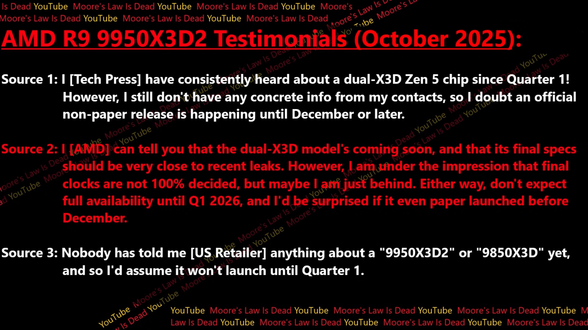 MLID, die de informatie van verschillende retail-, AMD- en "Tech Press"-bronnen doorgeeft, meldt dat de eigenlijke lancering van de Ryzen 9 9950X3D2 naar verwachting niet voor december zal plaatsvinden. Een AMD-bron beweerde dat de Ryzen 9 9950X3D2 "er binnenkort aankomt", maar dat de Ryzen 9 9950X3D2 pas vanaf Q1 2026 in de winkels verkrijgbaar zal zijn. Deze bron bevestigde ook dat de algemene specs die eerder uitlekten "dicht bij de definitieve specs" zouden moeten liggen. AMD zou echter enkele wijzigingen kunnen aanbrengen in de gerapporteerde kloksnelheden.