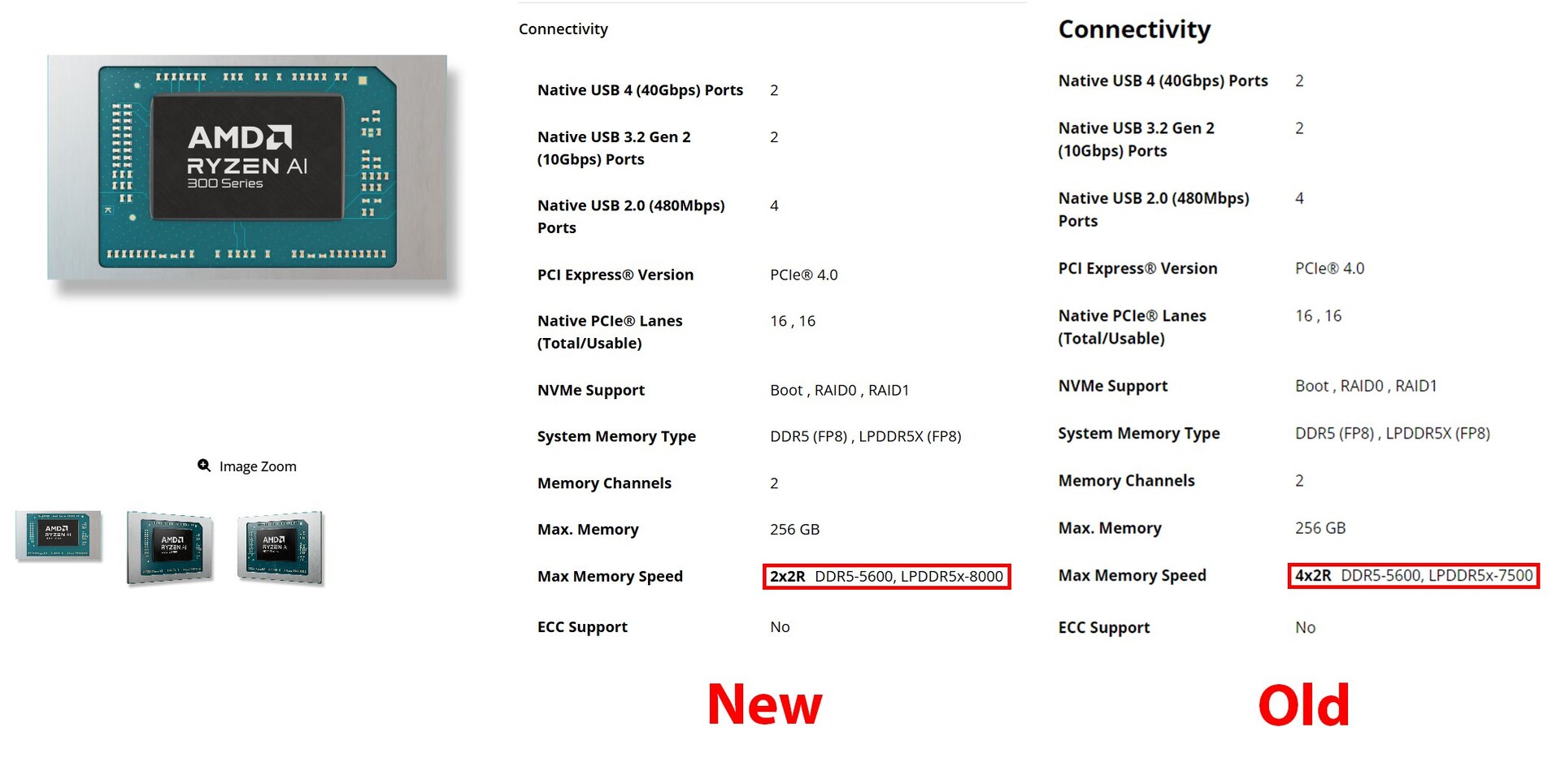 X-leaker @AnhPhuH zag de verandering op de officiële website van AMD. Ryzen AI-chips ondersteunen nu LPDDR5X-8000 geheugen, 500 MT/s sneller dan LPDDR5-7500 op het origineel. Voor niet-gesoldeerde oplossingen blijft dat cijfer gelijk op DDR5-5600. Het platform ondersteunt nu echter slechts twee DIMM's met DDR5-5600 in plaats van vier. De maximale hoeveelheid geheugen die door de Strix Point wordt ondersteund, blijft gelijk op 256 GB.