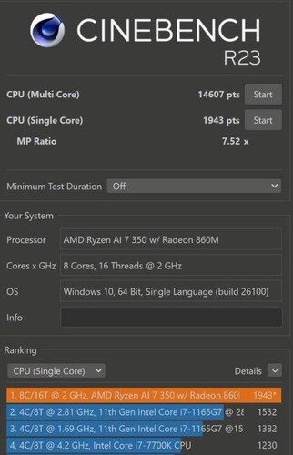 In Cinebench R23 scoort hij 1.943 en 14.607 punten in de single- en multicore tests. Het dichtstbijzijnde Strix Point-equivalent is de Ryzen AI 7 Pro 360die 1.958 en 13.794 punten scoort in dezelfde test. Hun scores zijn bijna identiek; niet verrassend aangezien ze min of meer dezelfde specificaties hebben. De voorsprong van de Ryzen AI 7 350 is groter in vergelijking met de Hawk Point-gebaseerde Ryzen 7 8845HS (1.766 en 16.161).