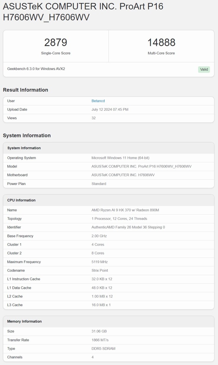 Het zal u niet verbazen dat de nieuwste Geekbench 6-invoer voor de Ryzen AI 9 HX 370 het volgende bevestigt eerdere berichten over de single-threaded uitmuntendheid van de chip. De APU behaalde een score van 2.879 in de single-core en een score van 14.888 in de multi-core test, die beide beter zijn dan een Geekbench 6 run uit juni.