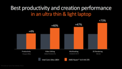 Qua prestaties is de Ryzen 9 AI HX 370 tussen de 4-73% sneller dan de Core Ultra 9 185H en 9-98% sneller dan de Apple M3 in productiviteitstoepassingen. Op dezelfde manier gaat AMD prat op een prestatieboost tot 60% ten opzichte van Qualcomm's nieuwe Snapdragon X Elite SoC.