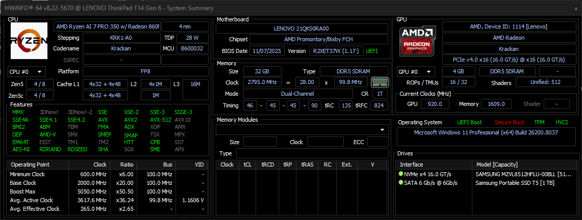 | Lenovo ThinkPad T14 Gen 6 AMD AMD Ryzen AI 7 PRO 350 ⎘ AMD Radeon 860M ⎘ 32 GB Geheugen, 512 GB SSD | Amazon: Catalogusprijs: 1800 Euro | 1.4 kg | 22.1 mm | 14.00" 1920x1200 162 PPI | |
