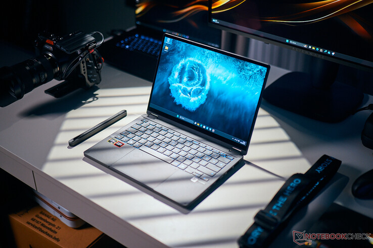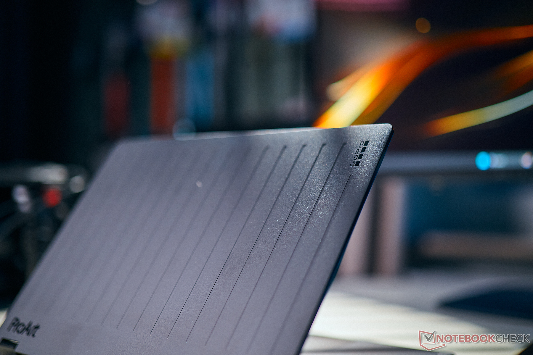 Hoewel de basisconstructie van het chassis gelijk is aan die van de voorganger, krijgt de nieuwe GoPro-editie enkele visuele aanpassingen en subtiele blauwe accenten. We houden vooral van het nieuwe designpatroon op het deksel met de matte textuur. Ze vallen op, maar zijn tegelijkertijd niet te opzichtig. Het basisstation heeft nog steeds het vertrouwde gladde oppervlak, dat in vergelijking met het deksel gemakkelijker vingerafdrukken aantrekt. De algemene kwaliteitsindruk (bouwkwaliteit en stabiliteit) is wederom uitstekend. U kunt het scherm van de convertible uiteraard omdraaien, wat hem erg veelzijdig maakt. Met ~1,4 kg is de PX13 een van de lichtste apparaten in onze vergelijkingsgroep van zeer krachtige compacte laptops.