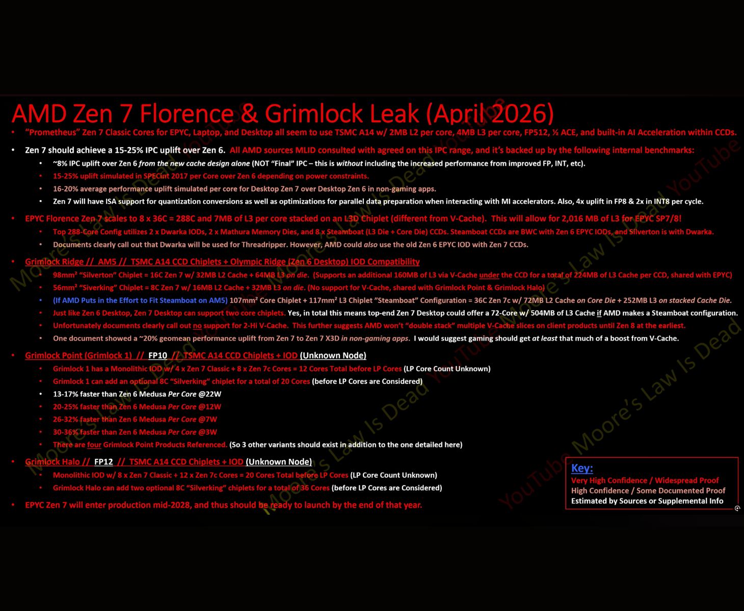 Volgens een reeks dia's die zijn gedeeld door de bekende hardwarelekker Tom, de gastheer van Moore's Law Is Dead op YouTube, AMD's Zen 7 EPYC vlaggenschipmet de codenaam Florence, gebaseerd op twee "Dwarka" I/O dies en twee "Mathura" geheugen dies, beide vernoemd naar oude Indiase steden van aanzienlijk historisch en spiritueel belang, gekoppeld aan maximaal acht 36-core Steamboat CCD's, wat 288 cores per socket oplevert.