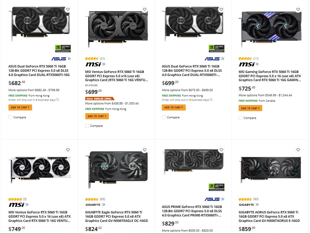 De meeste RTX 5070 Ti AIB-varianten op Newegg momenteel voor veel meer dan de $749 MSRP. Hetzelfde geldt voor de RTX 5060 Ti 16 GB. Gelukkig is de RX 9070 en RX 9070 XT nog steeds tegen redelijke prijzen te koop.