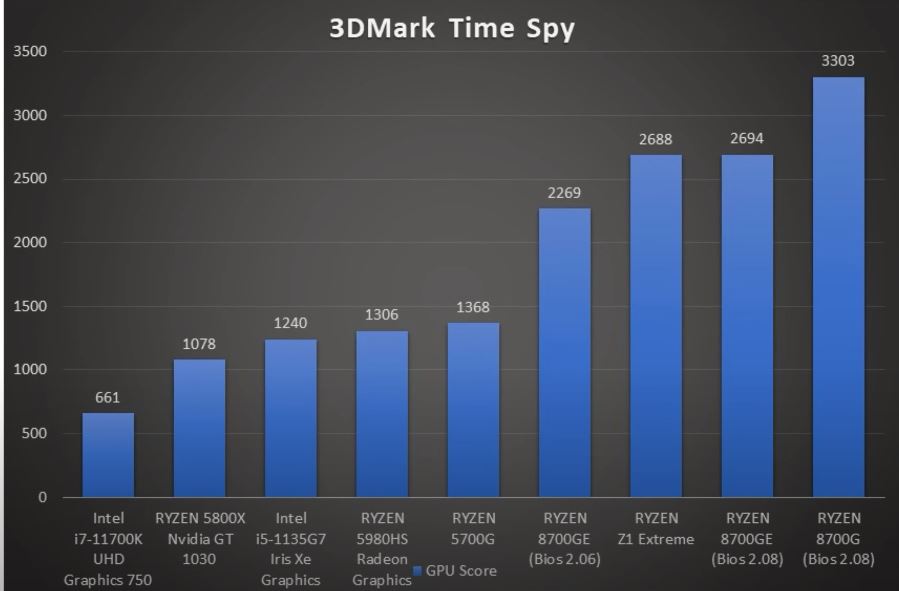 Wat de GPU-prestaties betreft, levert de op RDNA 3 gebaseerde 780M van de 8700GE zoals verwacht solide resultaten. Ondanks het verschil in stroomverbruik scoort de 8700GE 2.694 punten in de 3DMark Time Spy test, ongeveer 18% lager dan de 8700G's score van 3.303, terwijl hij minder dan de helft van het stroomverbruik heeft.