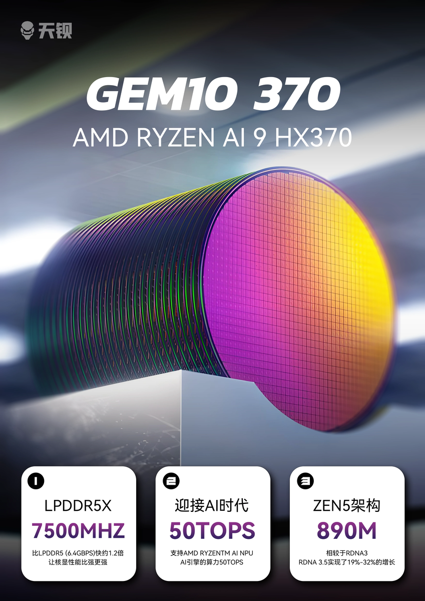 De GEM10 370 heeft een ultracompacte vormfactor. Met een volume van slechts 0,6 liter is hij draagbaar genoeg om in elke werkruimte te passen, maar krachtig genoeg om een breed scala aan professionele toepassingen aan te kunnen. Hij ondersteunt ook LPDDR5X-geheugen op 7500 MHz, wat bijna 1,2x sneller is dan LPDDR5. AMD biedt verder tot 50 TOPS aan rekenkracht voor AI-taken. Dit maakt het een geschikte optie voor mensen die werken met gegevensanalyse, het maken van content of realtime simulaties en betrouwbare prestaties nodig hebben zonder de omvang van een grotere machine.
