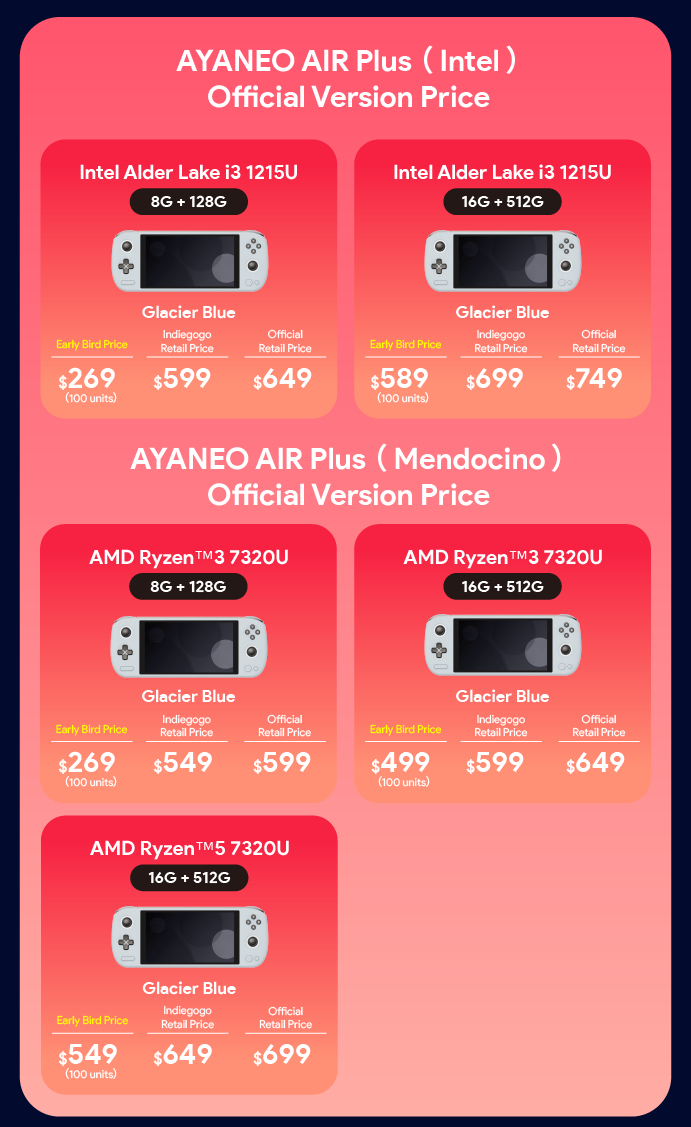 AYA NEO koos ervoor om slechts 100 stuks van elk van deze modellen te verkopen, die snel uitverkocht waren voordat ze kortstondig weer beschikbaar kwamen. Als zodanig begint de AIR Plus nu bij US$499 op Indiegogo met de Ryzen 3 7320U, 16 GB RAM en 512 GB opslagruimte. Ter referentie, de volledige AIR Plus prijzen zijn als volgt:
