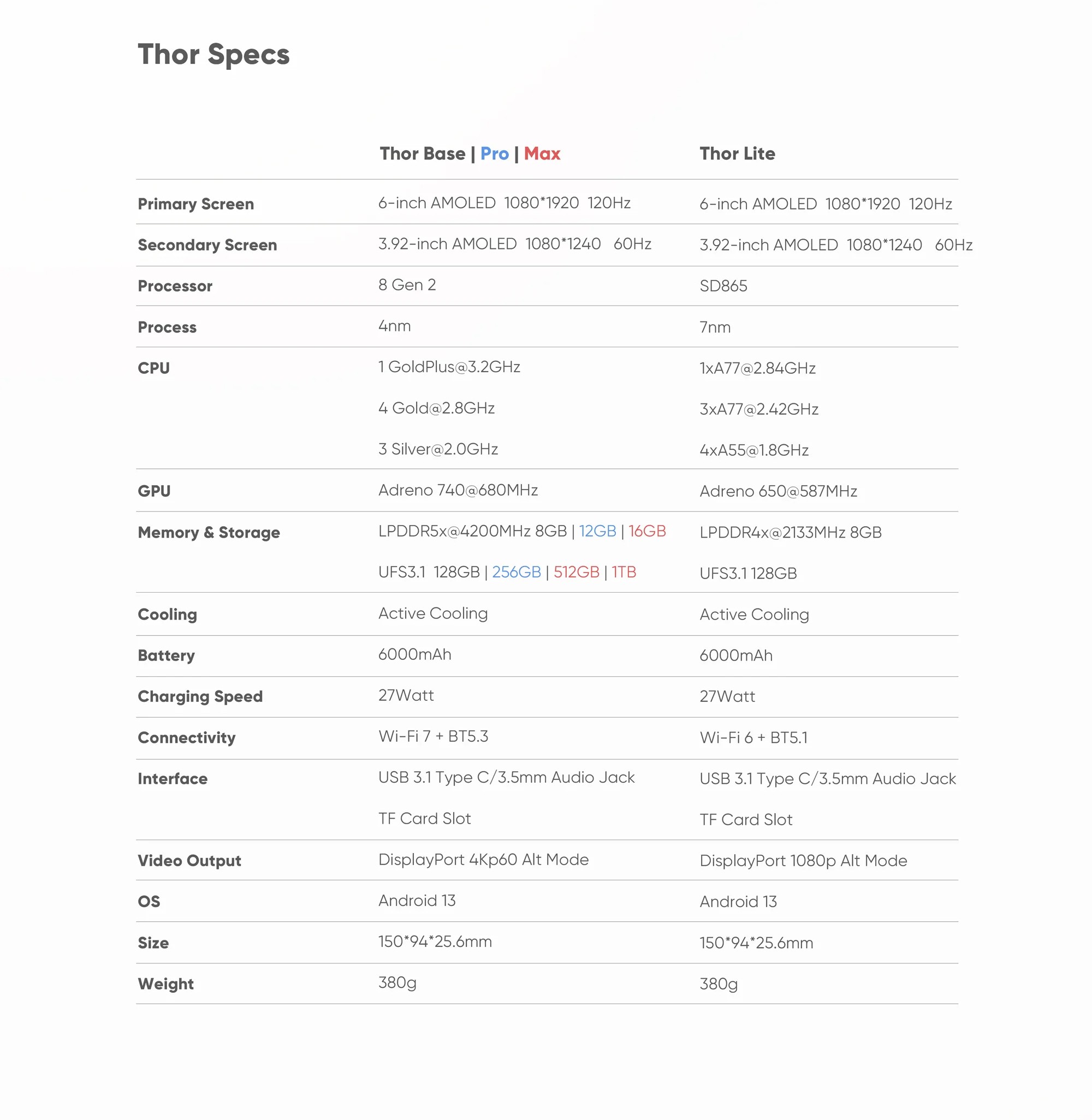 De wijziging in het opslagtype heeft invloed op de Snapdragon 8 Gen 2-aangedreven versie van de Thor. Dit omvat de Thor Base met 8GB RAM en 128GB opslag, de Thor Pro met 12GB RAM en 256GB opslag, en de Thor Max met 16GB RAM en 512GB opslag. De Thor Lite heeft een Snapdragon 865-processor maakt al gebruik van UFS 3.1 opslag en zal dat ook blijven doen.