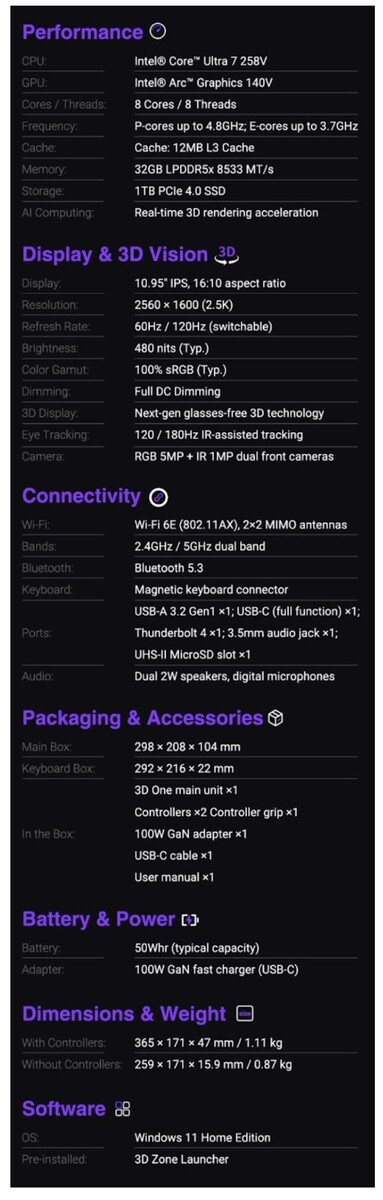 Hij weegt 0,87 kg (1,92 lbs.), wat vergelijkbaar is met een Surface Pro 10 van 0,885 kg (1,95 lbs.). De full-sized game controllers met Hall Effect joysticks voegen een extra 0,24 kg toe als ze zijn bevestigd. Net als bij de Surface Pro kan er een optioneel toetsenbord en standaard worden gekocht, waardoor de 3D One als 2-in-1 laptop kan worden gebruikt.
