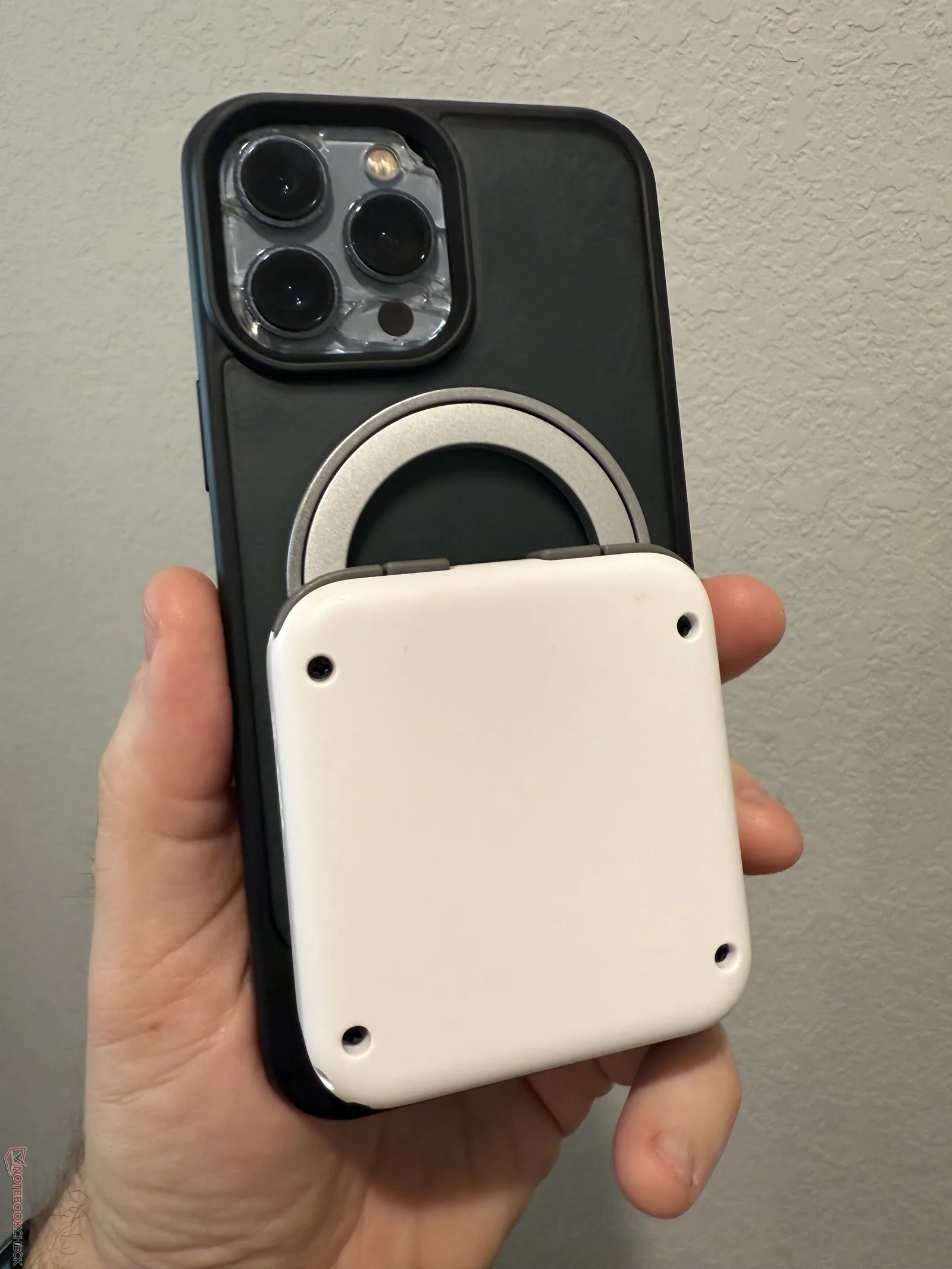 De magneet is een apart onderdeel van de controller, die aan de magneet wordt bevestigd en uitgelijnd via een kleine pin aan de bovenkant. Deze pen is echter niet zo stevig als men zou hopen, vooral bij grotere of zwaardere telefoons. Tijdens mijn test voelde een iPhone 13 redelijk stevig aan, maar een iPhone 13 Pro Max en iPhone 16 Pro Max voelden allebei wiebelig en niet stevig aan. Dat gezegd hebbende, de telefoons bleven op hun plaats tenzij ze opzettelijk geschud werden, in welk geval de magnetische ring loskwam van de controller.