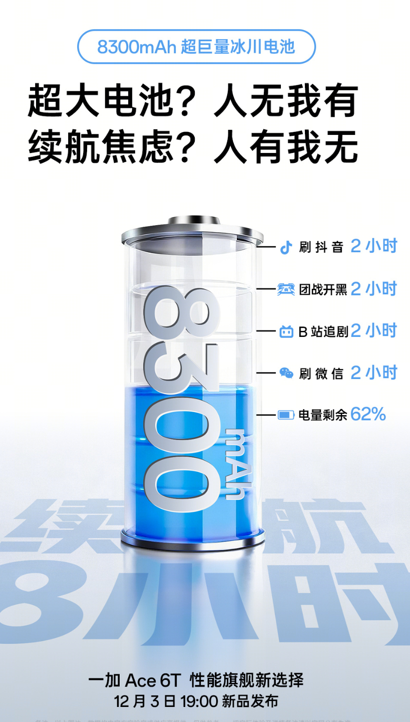 Nu heeft het bedrijf bevestigd dat de Ace 6T de grootste batterij zal hebben van alle smartphones die het tot nu toe heeft uitgebracht. Om even samen te vatten, de Ace 6 claimde die kroon vorige maand met een capaciteit van 7.800 mAh, wat 500 mAh meer is dan de OnePlus 15. In een nieuwe reeks teasers heeft OnePlus onthuld dat de Ace 6T hetzelfde voordeel zal hebben ten opzichte van de Ace 6 dankzij een 8.300 mAh batterij die 100 W bedraad opladen ondersteunt.