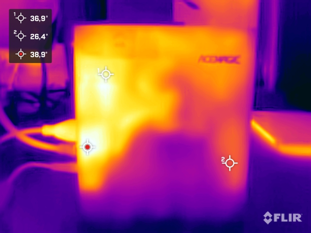 In de meeste scenario's werkt de Acemagic AD15 zeer stil, hoewel de ventilatoren zelden stilstaan als het apparaat stationair draait. Met een geluidsdrukniveau van slechts 25 dB(A) is het apparaat bijna onhoorbaar bij stationair draaien. Bij gemiddelde belasting horen we iets meer dan 28 dB(A). Bij maximale belasting kan echter tot 42,4 dB(A) gemeten worden. De maximale waarde wordt echter niet consequent bereikt tijdens de stresstest. In de tussentijd daalt het geluidsniveau tot ongeveer 40 dB(A).