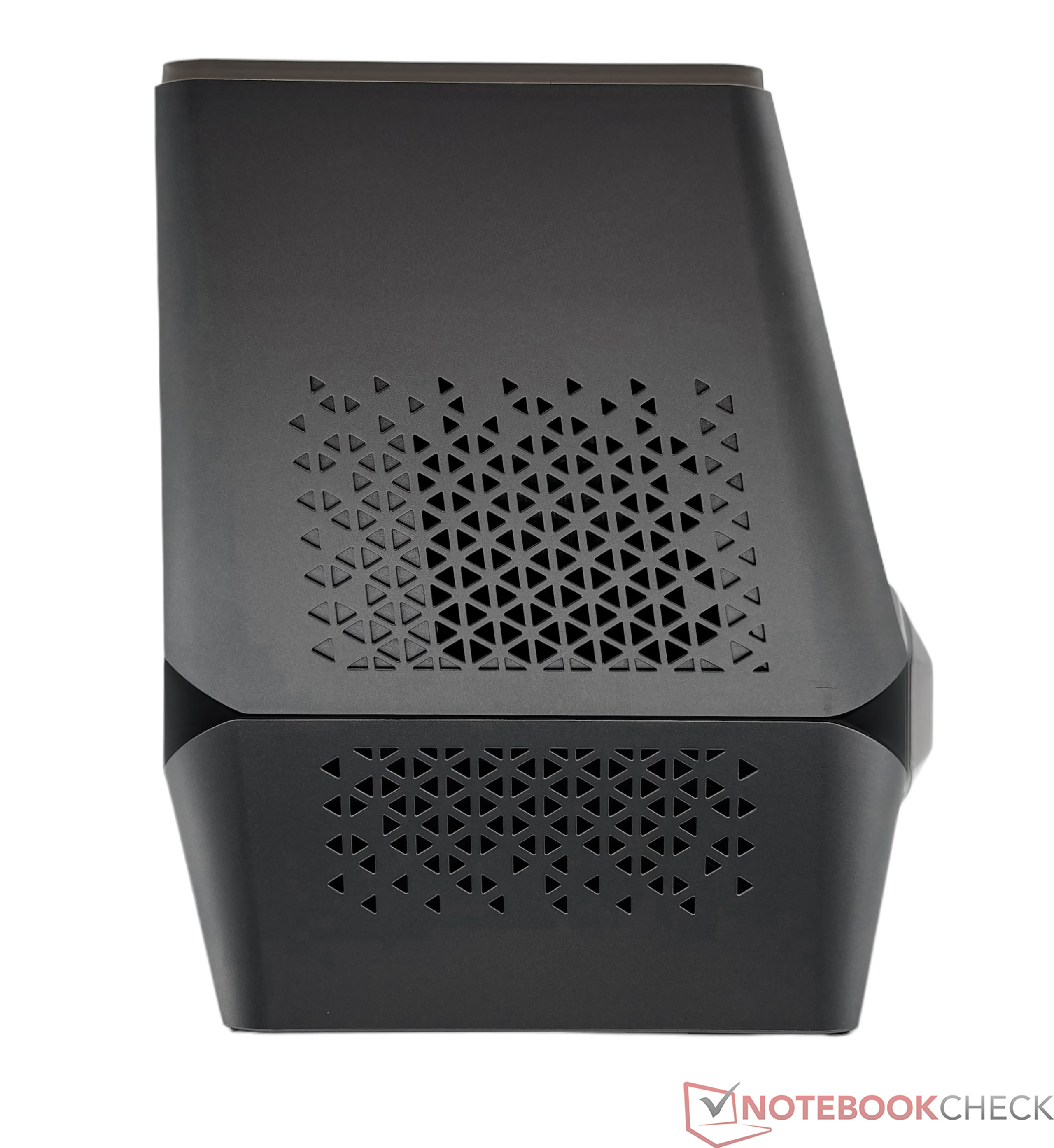 De Acemagic M2A Starship heeft een extreem hoge herkenningswaarde door zijn uiterlijk. De fabrikant verpakt de hardware in een extravagante behuizing die eruitziet als een ruimteschip. Iedereen die op zoek is naar een PC met een ongewoon uiterlijk zal zeker genieten van de Acemagic M2A. Bij de materiaalkeuze is voornamelijk plastic gebruikt. Dit is niet erg, want de zilverkleurige elementen passen perfect bij het zwarte plastic chassis. De voetafdruk van de opvallende mini-pc is iets groter dan die van andere concurrenten. Toch gaat de Acemagic M2A Starship niet helemaal over de top. Het gewicht van het testexemplaar is iets meer dan 2,1 kilogram, met de enorme 300-watt voeding die nog eens 1,1 kilogram weegt. Het apparaat is stevig gebouwd en biedt ook een hoge mate van stevigheid. Desondanks kan de behuizing barsten onder belasting als het apparaat koud is en warm wordt onder belasting tijdens het gamen.