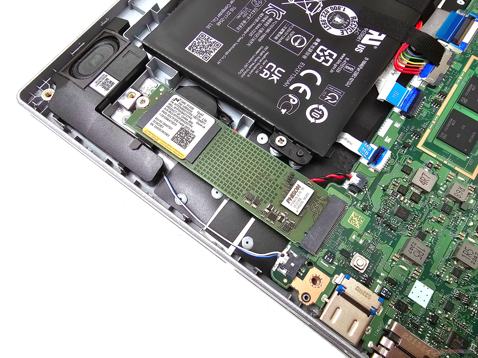 Gebruikers hebben toegang tot de binnenkant van de Acer Aspire 3 door elf Torx T5-schroeven los te draaien, waarvan er één verborgen zit onder een "garantie vervalt bij breuk" sticker. Opslag uitbreiding is mogelijk dankzij het gebruik van een off-the-shelf SSD. Geheugen, aan de andere kant, is niet omdat het aan het moederbord is gesoldeerd. Dat is niet per se een slechte zaak, want de laptop kan profiteren van snellere LPDDR5 modules.