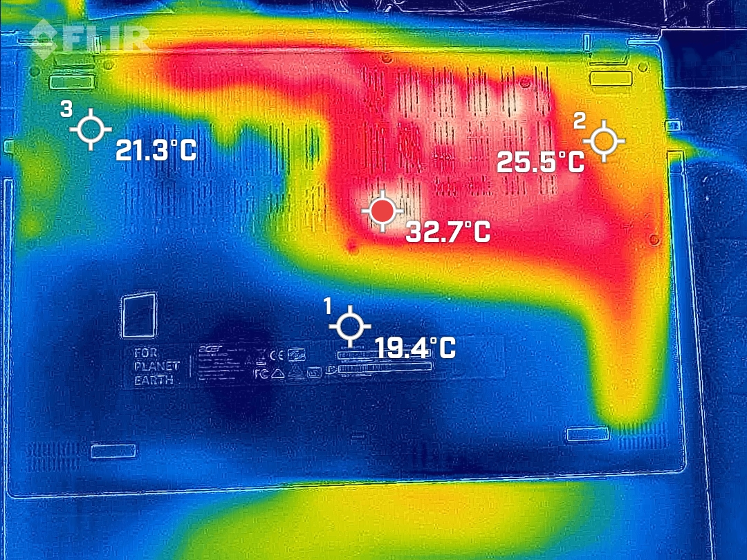 De oppervlakken van Acer's duurzame kantoorlaptop blijven zeer koel tot 43 °C. DeIdeaPad 5 Pro 16 wordt aanzienlijk warmer onder volledige belasting bij 48 °C, vergelijkbaar met deKaderlaptop bij 47,4 °C.