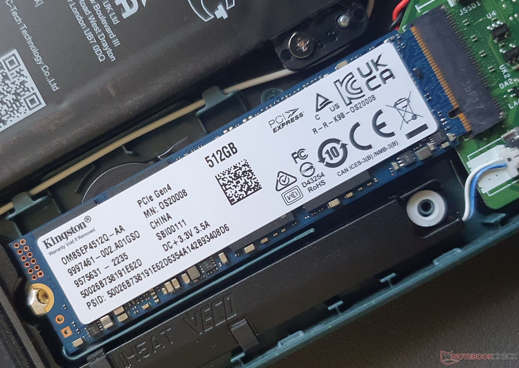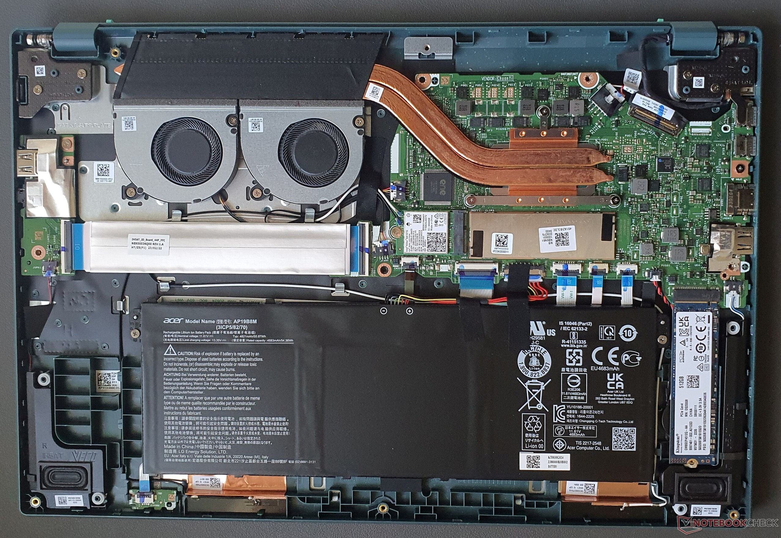 Na het verwijderen van 11 kruiskopschroeven kunt u vrij gemakkelijk bij de binnenkant van de behuizing van de laptop komen met behulp van een spudgereedschap of een plastic chip. Het is teleurstellend om te zien dat het RAM-geheugen volledig vastgesoldeerd is, terwijl het 2022 model van de 15,6 inch Acer laptop een tweede RAM-sleuf heeft. Wij zouden dit eerder als essentieel beschouwen als u rekening houdt met het onderwerp duurzaamheid. De M.2-2280 SSD kan tenminste worden verwisseld, net als de WLAN module, de vastgeschroefde batterij en de BIOS batterij. Een tweede M.2-2280 slot is ook verborgen onder de verbindingskabel naar het moederbord.