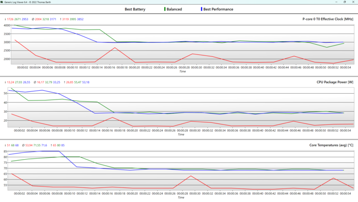 Tijdens onze gecombineerde stresstest (Prime95 + FurMark) klokten de P-kernen van de CPU op 1,8 GHz - net boven hun basiskloksnelheid van 1,7 GHz. De GPU klokte op 800 MHz, precies tussen de minimum en maximum kloksnelheden van 400 MHz en 1300 MHz in. De temperatuur van de CPU lag net boven de 70 °C, wat nog steeds koel is. Een GPU-benchmark die direct daarna werd uitgevoerd, leverde geen prestatiedalingen op.