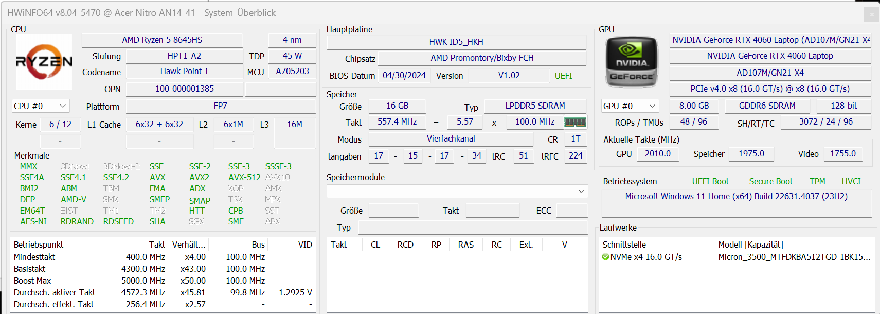 | Acer Nitro 14 AN14-41-R3MX R5 8645HS, GeForce RTX 4060 Laptop GPU, Micron 3500 MTFDKBA512TGD, IPS, 2560x1600, 14.5" | Razer Blade 14 RZ09-0508 R9 8945HS, GeForce RTX 4070 Laptop GPU, Samsung PM9A1 MZVL21T0HCLR, IPS, 2560x1600, 14" | Lenovo LOQ 15IRX9 i5-13450HX, GeForce RTX 4060 Laptop GPU, Micron 2400 MTFDKCD1T0QFM, IPS, 1920x1080, 15.6" | Asus TUF Gaming A15 FA507UV R9 8945H, GeForce RTX 4060 Laptop GPU, WD PC SN560 SDDPNQE-1T00, IPS, 1920x1080, 15.6" | Schenker XMG Core 15 (M24) R7 8845HS, GeForce RTX 4060 Laptop GPU, Samsung 990 Pro 1 TB, IPS, 2560x1600, 15.3" | HP Omen Transcend 14-fb0014 Ultra 7 155H, GeForce RTX 4060 Laptop GPU, WDC PC SN810 1TB, OLED, 2880x1800, 14" | Acer Predator Helios Neo 14 (2024) Ultra 9 185H, GeForce RTX 4070 Laptop GPU, SK Hynix PC801 HFS001TEJ9X125N, IPS, 3072x1920, 14.5" | Gemiddeld NVIDIA GeForce RTX 4060 Laptop GPU | Gemiddelde van klas Gaming | |