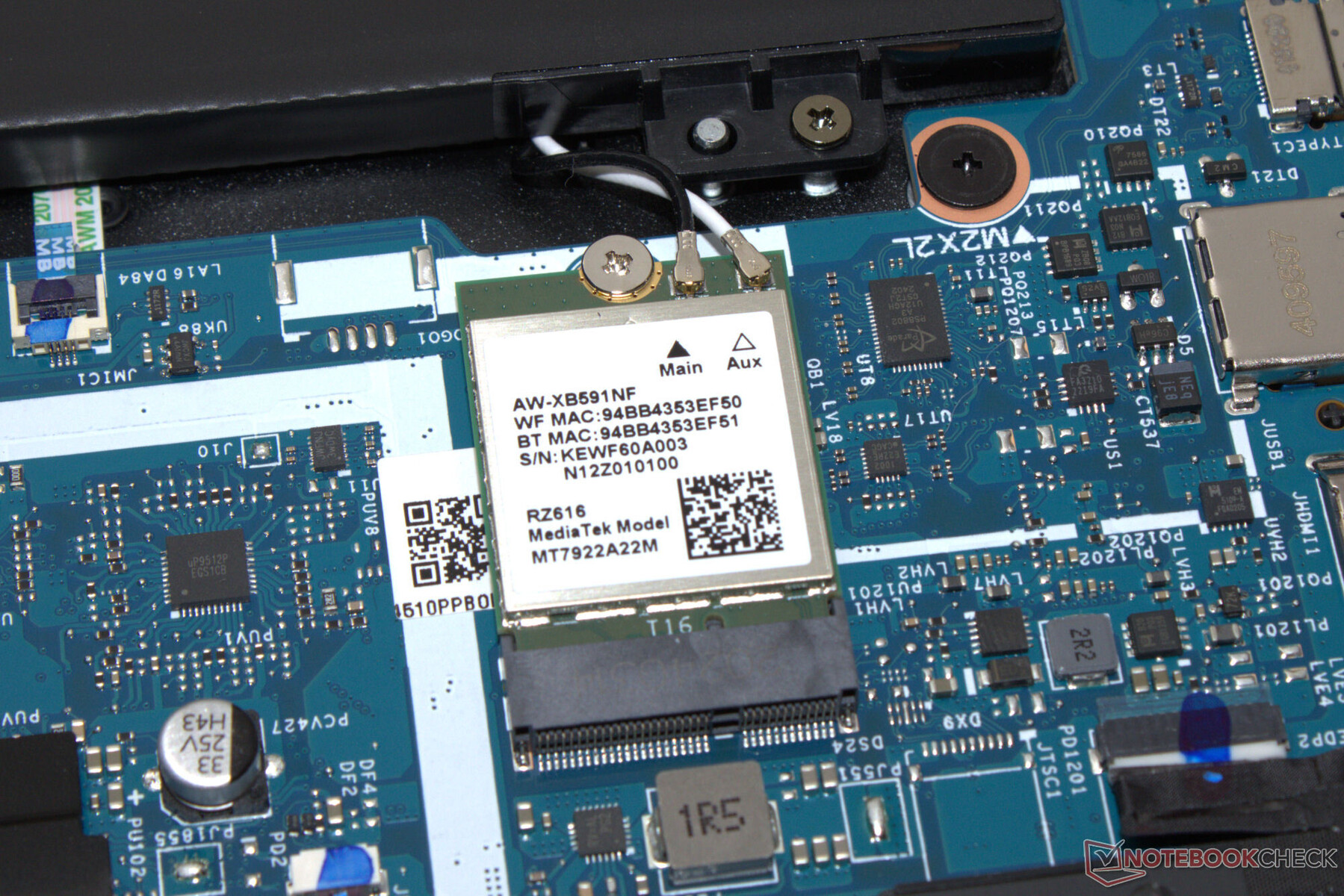 Om de bodemplaat te verwijderen, draait u eerst alle schroeven aan de onderkant los. Vervolgens maakt u aan de bovenkant van de laptop de plastic balk achter het beeldscherm los. Naast een priem of spudger kan een vingernagel ook handig zijn voor deze stap. Wees voorzichtig wanneer u de bar vervolgens weer vastmaakt, want er zijn veel kleine, gemakkelijk breekbare plastic clips. Gebruik tot slot bovengenoemd gereedschap om de bodemplaat los te maken. Iets anders om op te letten is dat de uitlaatopeningen aan de achterkant deel uitmaken van de bodemplaat. Zodra de plaat verwijderd is, hebt u toegang tot de PCIe 4.0 M.2-2280 SSD, de Wi-Fi-module samen met de antennes, de ventilatoren en de batterij. Er zijn geen geheugensleuven omdat het RAM gesoldeerd is.