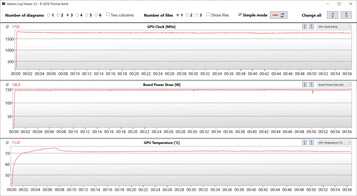 De stresstest (Prime95 en FurMark zijn continu geactiveerd) is een extreem scenario waarmee we de stabiliteit van het systeem onder maximale belasting kunnen onderzoeken. De CPU (4,2 tot 4,3 GHz) en GPU (1.000 tot 1.600 MHz) beginnen de test met hoge kloksnelheden. Terwijl de kloksnelheid van de CPU in de loop van de test licht daalt, stabiliseert de kloksnelheid van de GPU zich op een hoog niveau.