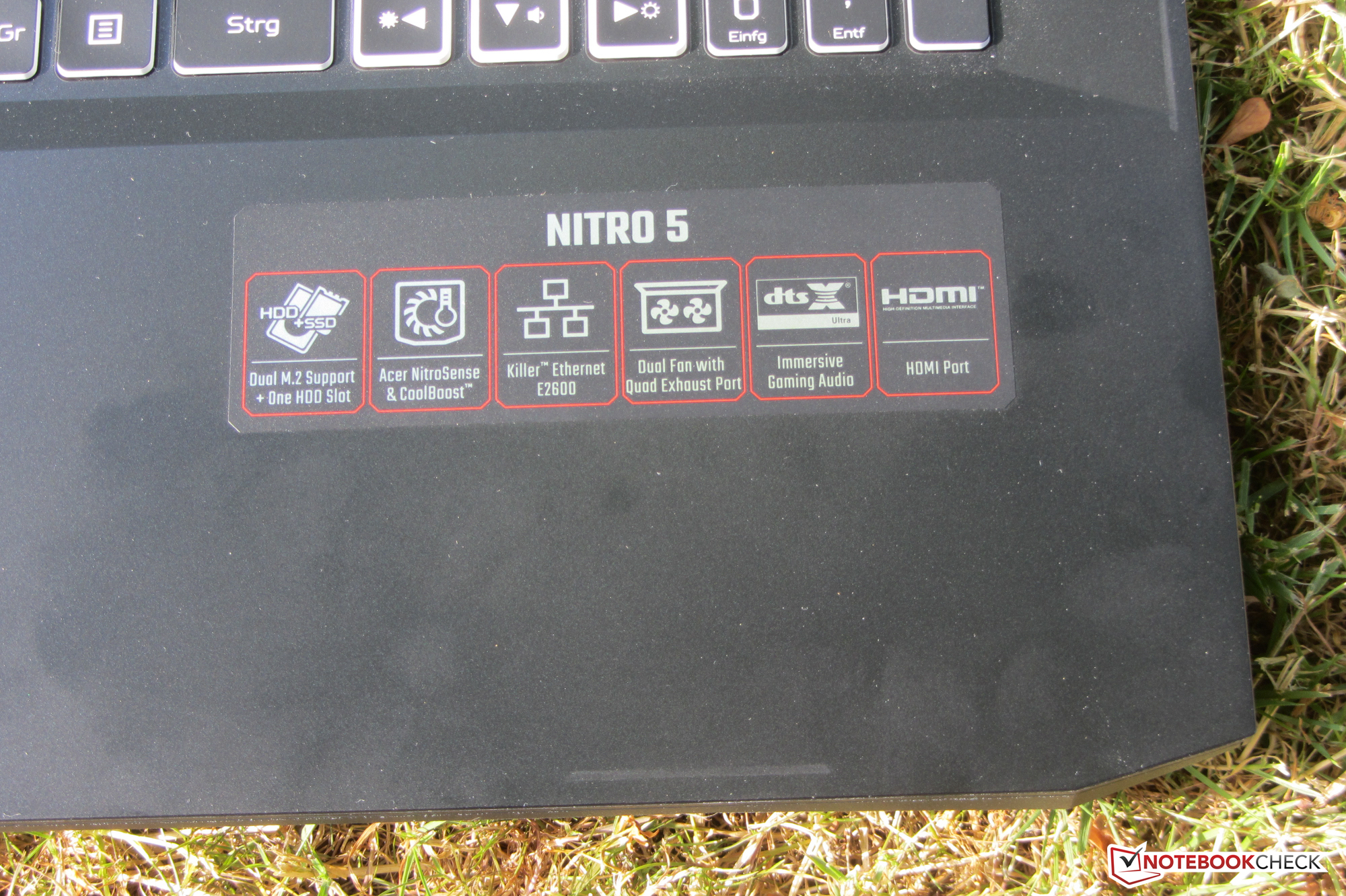 Acer gebruikt geen high-end materialen voor de behuizing van de Nitro 5. De behuizing is gemaakt van zwart plastic. Het wijnrode gebied tussen de achterste luchtopeningen en de rode "Nitro" belettering op het scharnierdeksel voegen een beetje kleur toe. De gladde oppervlakken van het chassis zijn nogal gevoelig voor vingerafdrukken. Er is geen onderhoudsluik. De batterij is binnenin vastgeschroefd.