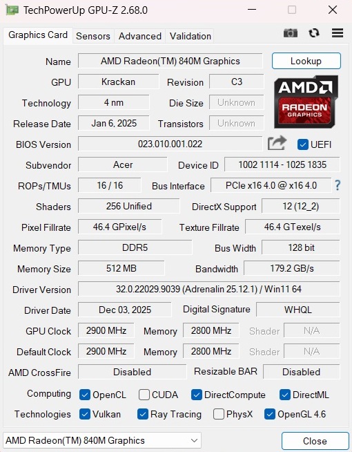 U hoeft ook geen topprestaties van de Nitro V14 AI te verwachten. De TGP van de geïnstalleerde GeForce RTX 5050 grafische kaart is beperkt tot 60 W, wat enigszins onder de capaciteiten van de kaart ligt.